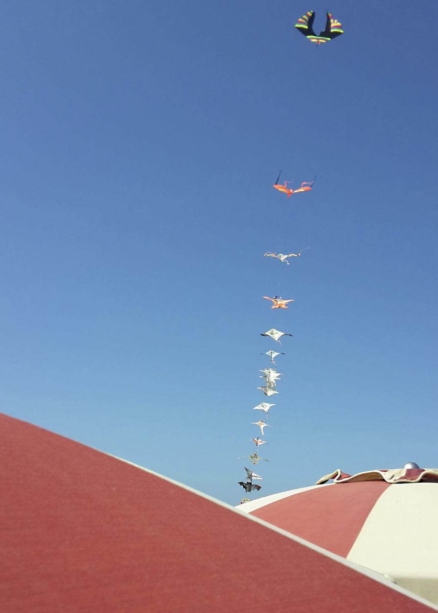 Ottimo il modo in cui hai tagliato via tutto quanto di disturbante c'è in una spiaggia sfruttando anzi gli ombrelloni a mò di orizzonte da cui far partire il filo della mercanzia.