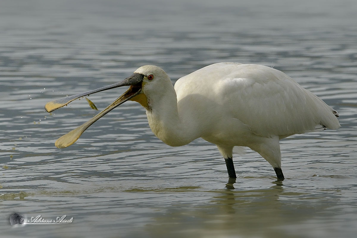 Nonostante lo sproporzionato becco la spatola riesce comunque a gestire bene piccole catture come questo piccolo pesciolino.