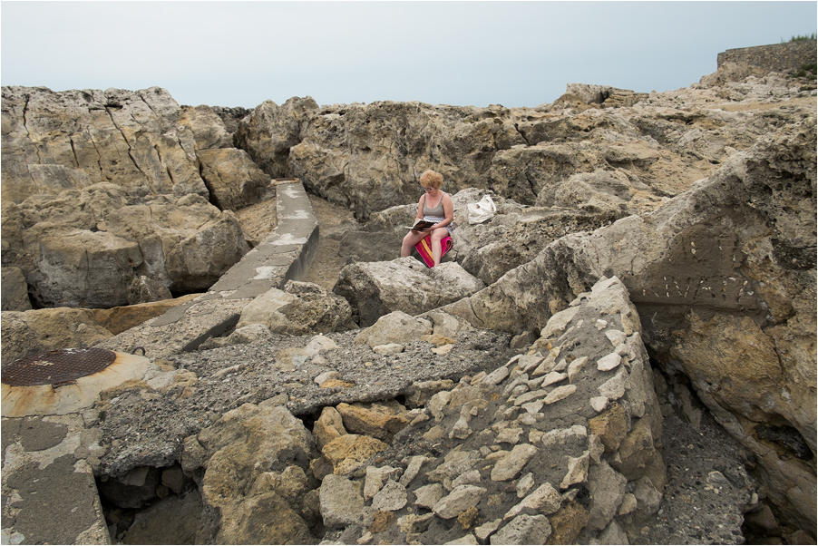 Hai fatto bene a inquadrare solo rocce e cielo: in questo modo l'elemento umano assume più rilievo e viene percepito come immerso nella sua stessa ricercata tranquillità.