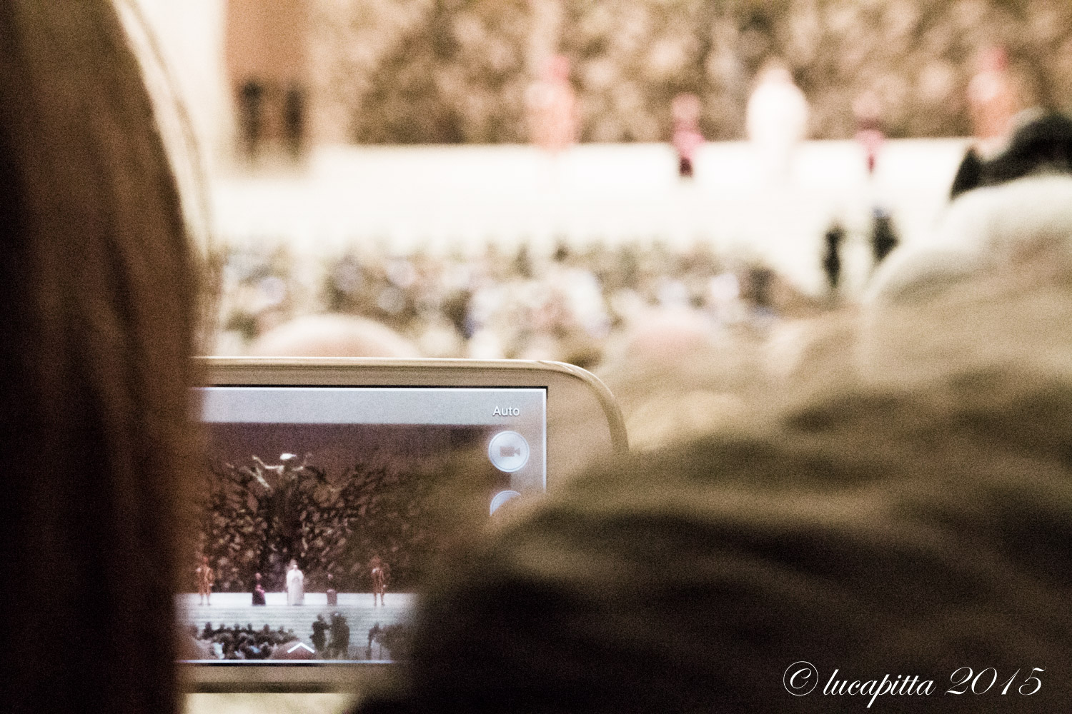 Fosse stato chiaro, nitido e leggibile il papa sullo smartphone questa foto avrebbe un senso, in questo caso pero' e' tutto impastato, la parte superiore molto chiara e al limite del palco, distrae e ruba la scena, le due teste che impallano lo smartphone danno l'impressione di una foto fatta al volo, senza un progetto di composizione.
