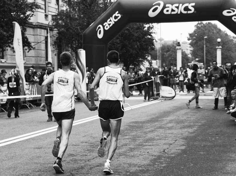 Qui sono un esperto ... no, non di fotografia. Facevo maratone anche se molto tempo fa. E credo si tratti dell'arrivo di una maratona dove spesso si vedono queste scene. E' possibile che i due stiano coronando un traguardo inseguito non solo per 42,195 Km ma anche dopo mesi di allenamenti magari anche quelli ... insieme.