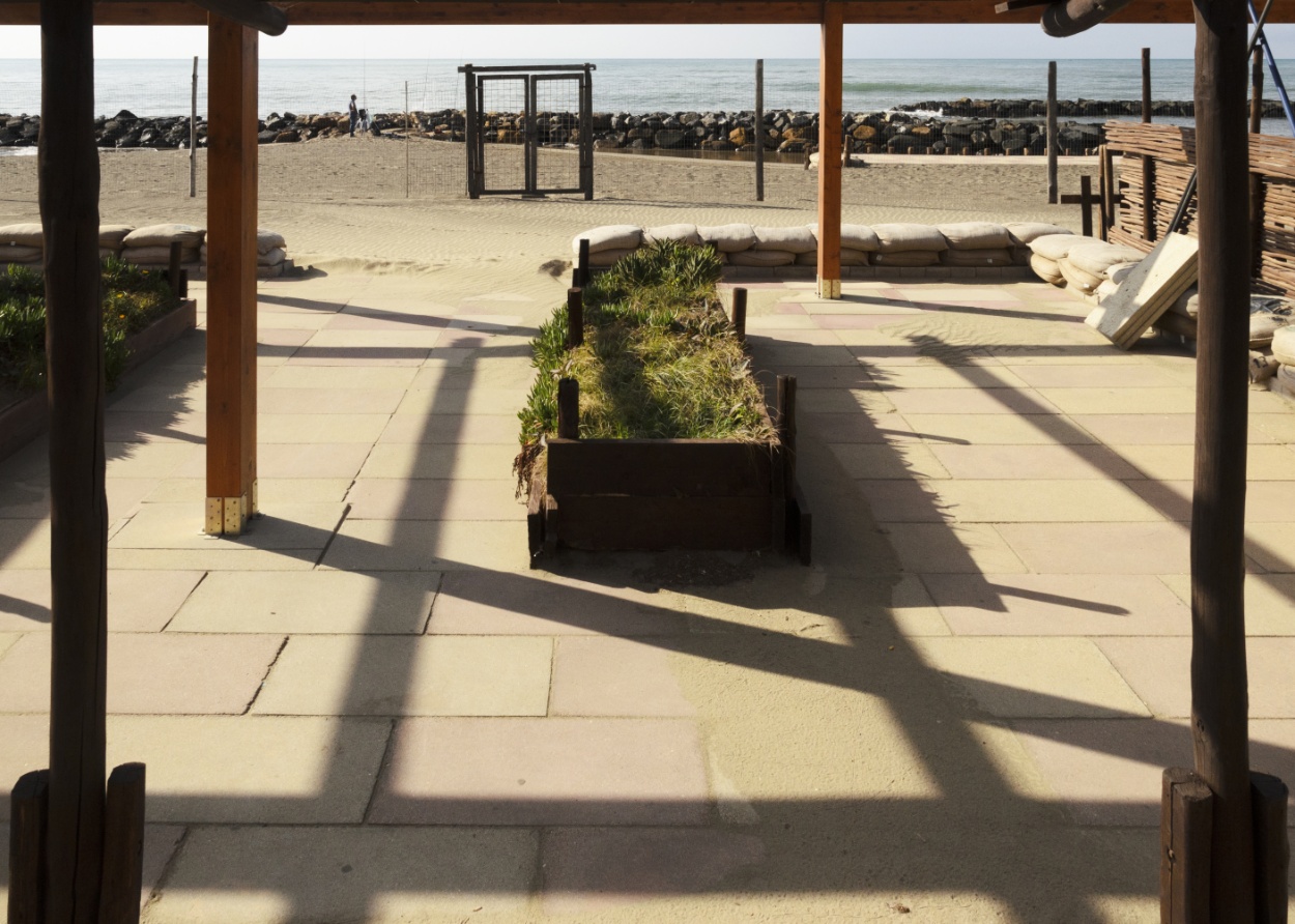 Interessante questo scorcio di luogo balneare in assetto di guerra contro l'inverno!Belle le geometrie disegnate da pali ed ombre.