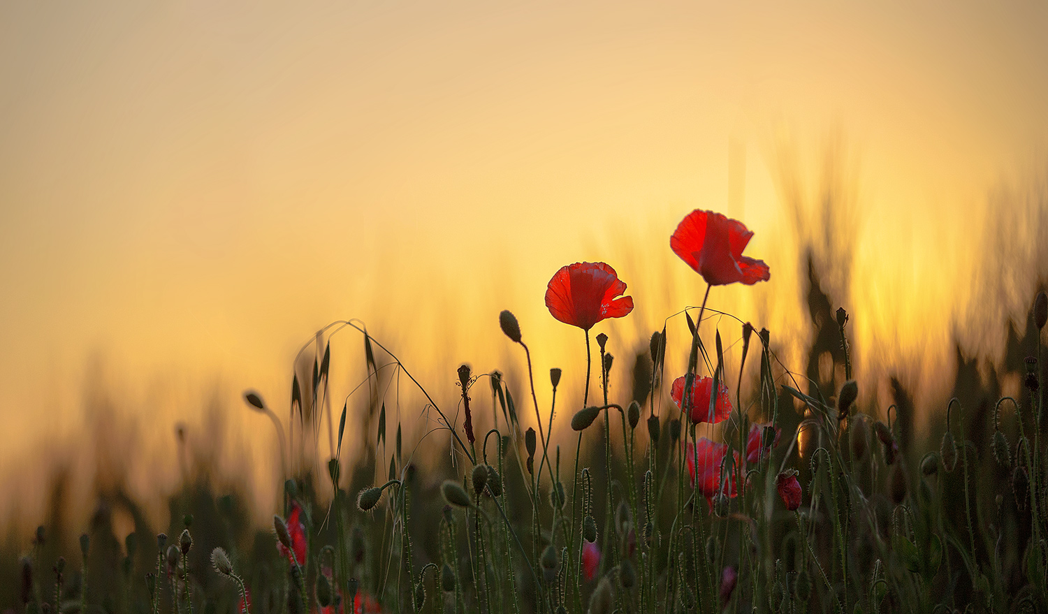 E i papaveri che galleggiano su su questo palcoscenico, emergendo dal campo con una trasparenza speciale nel rosso, attraversato dall'ultimo sole. Molto bella.