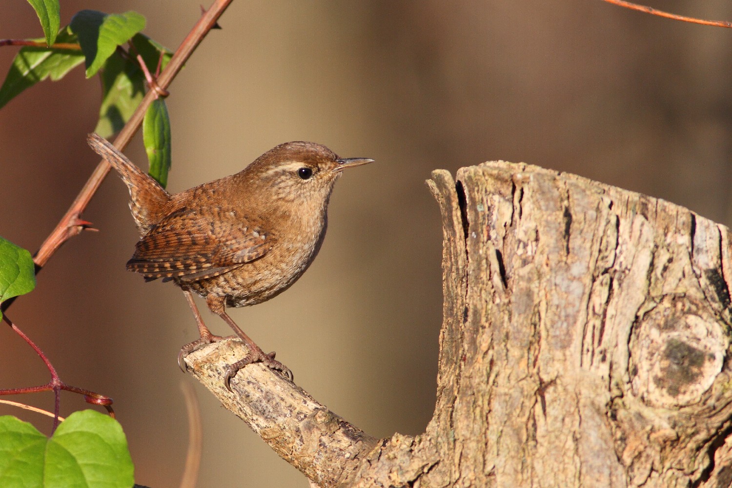 Il tronco occupa un tantino l'immagine ma la simpatica posizione dello scricciolo rende l'immagine piacevole da vedersi.