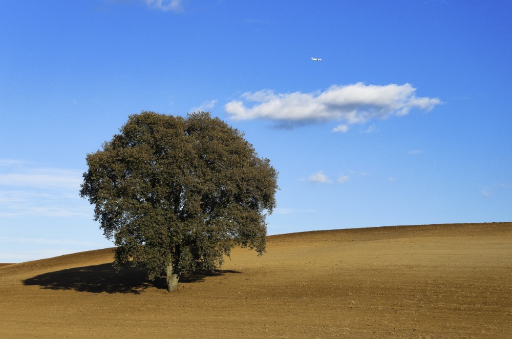Per quanto solo possa essere, è comunque una presenza maestosa, imponente. Mi piace anche la terra appena arata e il riprendere parte della tonalità del colore con le foglie.