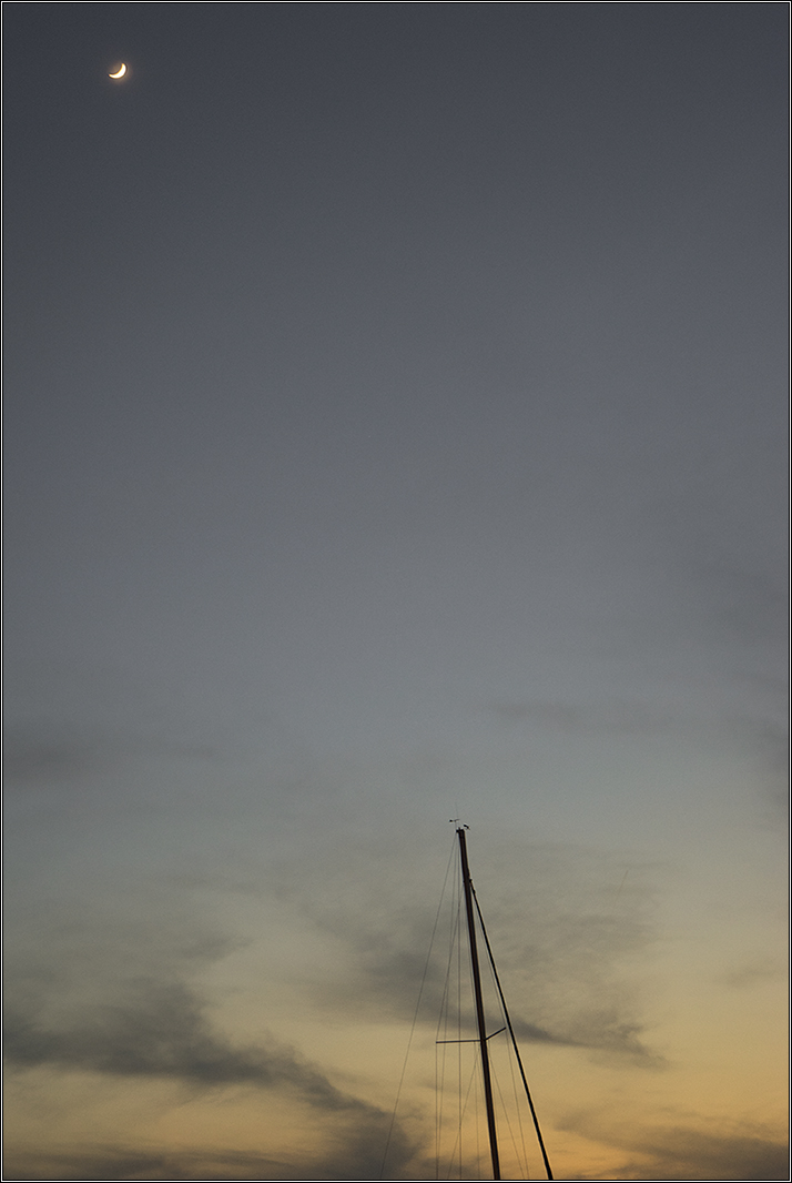 Io la trovo molto carina ed elegantemente minimale. Però, rispetto ad altre tue sul genere, ho come la sensazione che compositivamente ci sia qualcosa di disarmonico. Forse dando un pizzico di lateralizzazione in più all'albero della imbarcazione, al vertice invisibile di una ipotetica diagonale con la luna, per me risulterebbe più piacevole. L'albero è inclinato, e ciò è realistico, potrebbe essere anche tua intenzione farlo puntare alla luna come direzione, ma io mi sono permessa, non ho resistito, dal fare una piccola interpretazione mia, alterando leggermente le tinte e componendo in modo più scolastico certamente, ma aggiungendo un pizzico di contrasto in più. Anche attorno alla luna ho diminuito la lieve foschia alone che la coinvolge. La allego nel più assoluto rispetto per la tua versione.