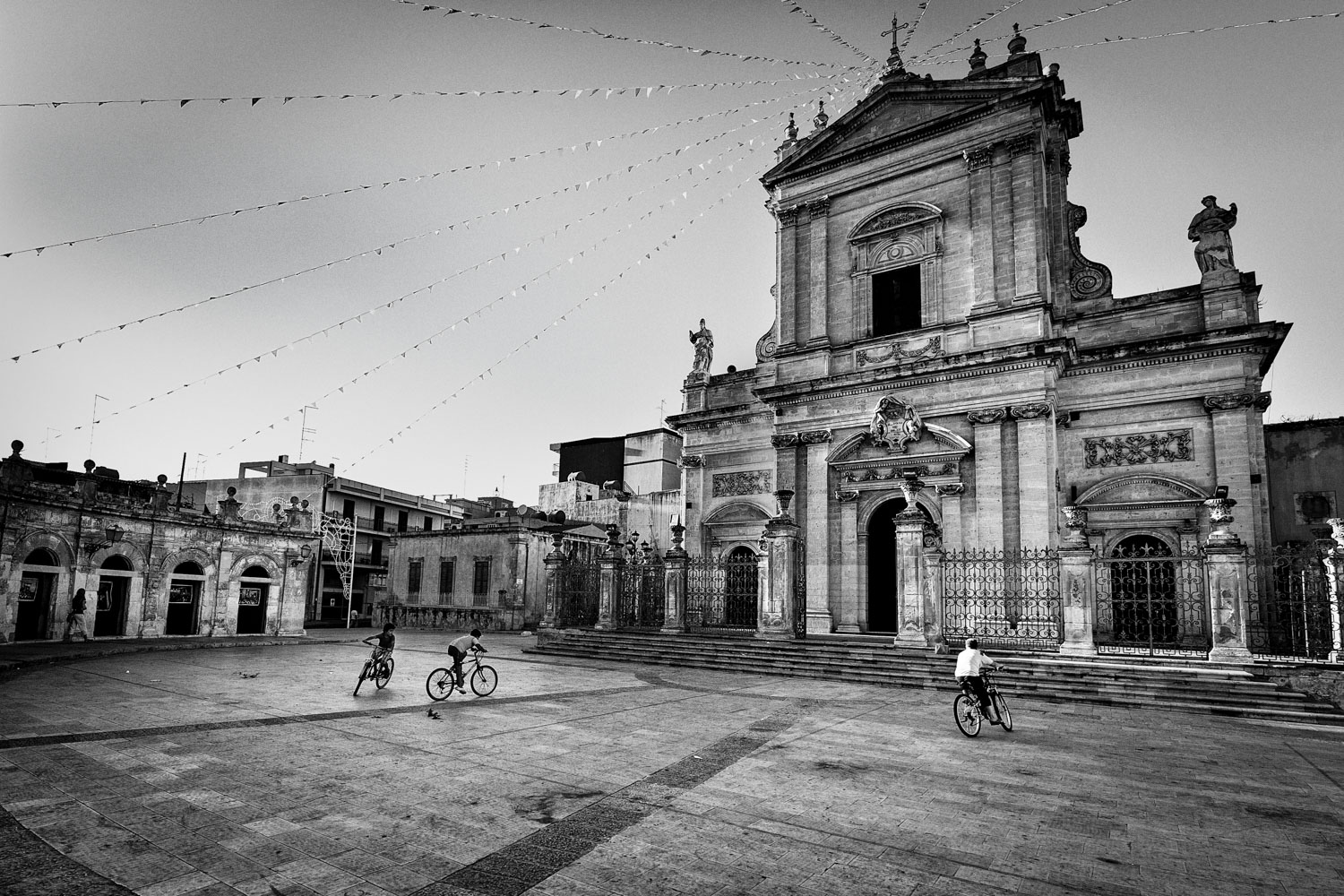 In piazze sicule come queste abbiamo visto lo scorrere delle vicende della " sedotta e abbandonata " e non mi stupirei se quei ragazzi in bici stessero ancora girando le scene postume. Bel b/n dal sapore sanguigno e genuino. |