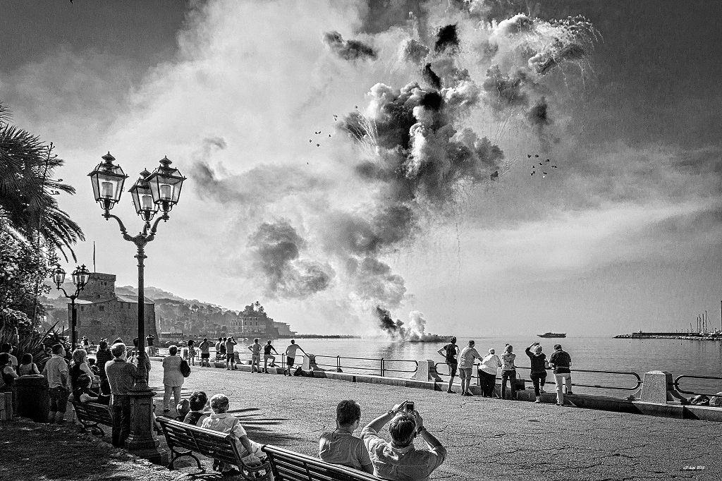 A rapallo l'1-2-3 luglio si fanno i festeggiamenti alla Madonna di Montallegro. 3 giorni di fuochi. Qua mi piaceva l'attenzione delle persone mentre andava la sparata delle 08 del 01 luglio. Canon EOS 100D 1/1600 f 5.6 18-55mm iso-100 Silver Effect.