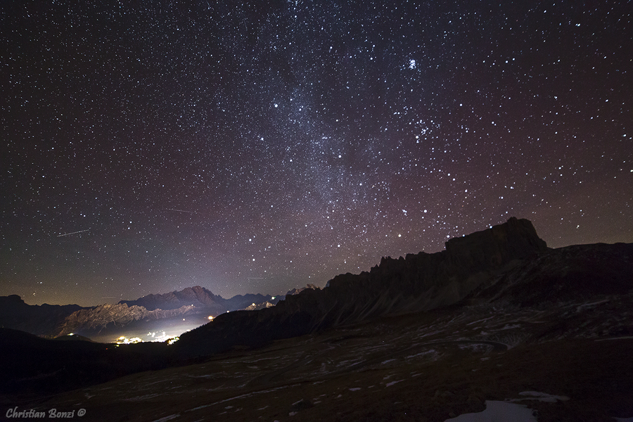 Una ripresa notturna molto grandangolare dal Passo Giau in direzione est verso la conca di Cortina con un risultato affascinante. Quel bagliore cittadino, quel tripudio di stelle, quei profili dolomitici sono ottimi elementi per una gran bella immagine. C'è una inclinazione notevole antioraria, che si nota bene dalla disposizione anomala del Gruppo dei Lastoni del Formin in primo piano, ma non mi appare un difetto per il risultato finale. Ciao, Francesco _________________ Fotocamere Olympus OMD e PEN, Panasonic G3. Software GIMP