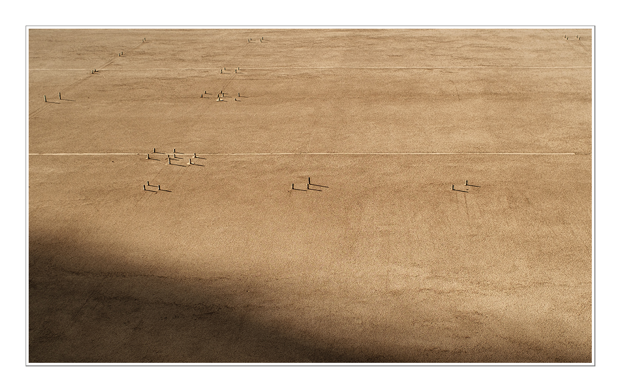 Piccoli elementi verticali che punteggiano la vasta omogeneità della superficie, e un'ombra importante che, a mio parere, da il carattere alla scena e le regala uno spessore altrimenti non immaginabile.