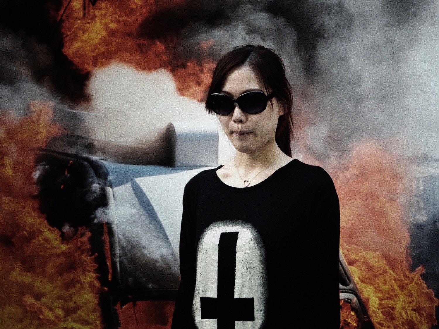 Qui mi sono trovato a riprendere una ragazza cinese che con quella maglietta nera con una croce e gli occhiali neri su sfondo catastrofico mi ha fatto pensare (dopo aver visionato lo scatto) a qualcosa di biblico, di catastrofico e allora mi è venuto in mente il titolo "sindrome cinese" che riguarda una catastrofe nucleare che forse proprio i cinesi potevano portare (vecchi pregiudizi) e il soggetto doveva rappresentare la punizione divina trasfigurata nel diavolo cinese. A questo riguardo ho illuminato maggiormente il soggetto come in uno spot mentre ho abbassato le luci tutto intorno, inoltre ho applicato un effetto di grana per sporcare l'immagine.