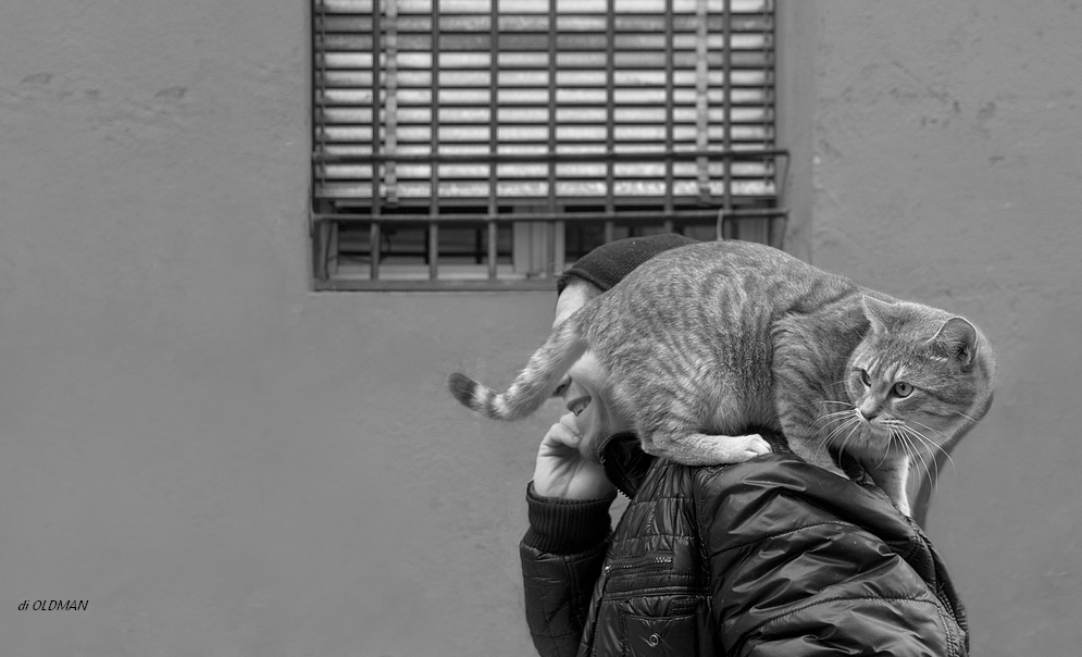 comunque anche senza occhi si legge l'espressione ilare del portatore di gatto  |