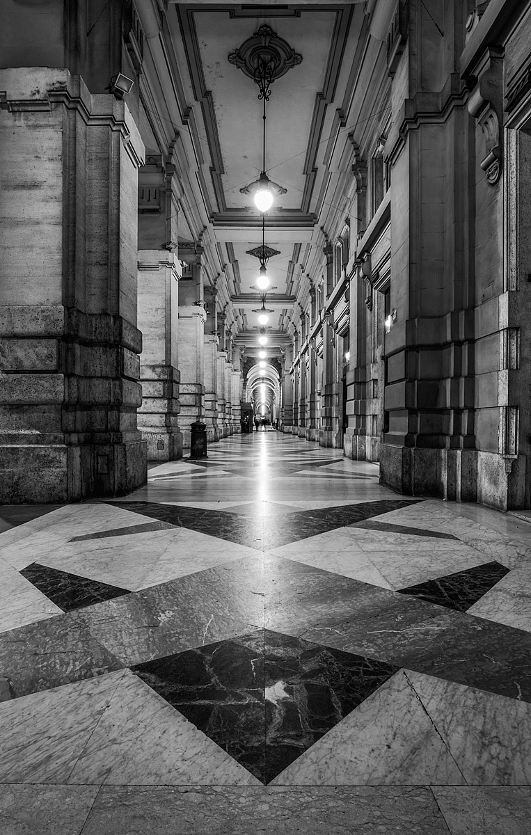 Un bellissimo b/n, con ottima gestione di luci e chiaroscuro. La scelta di includere molta pavimentazione la trovo efficace in questo caso.