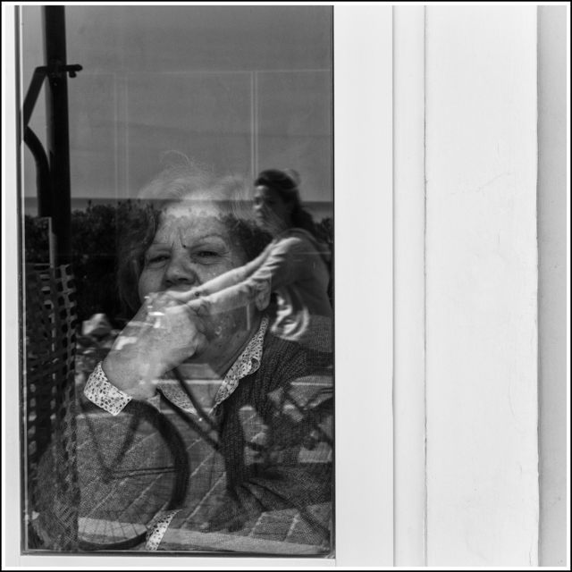 Ciao Simone, immagine che sembra svilupparsi interamente in una vaga realtà a due dimensioni, la figura della signora potrebbe esser benissimo un secondo riflesso, da qua la mia sensazione di una materialità senza volume, come fosse immagine ancor prima di divenirlo. Potrei anche supporre che, rigirando il titolo, la giovane ciclista veda riflessa se stessa fra qualche lustro. Buono scatto che offre validi spunti. Un saluto.