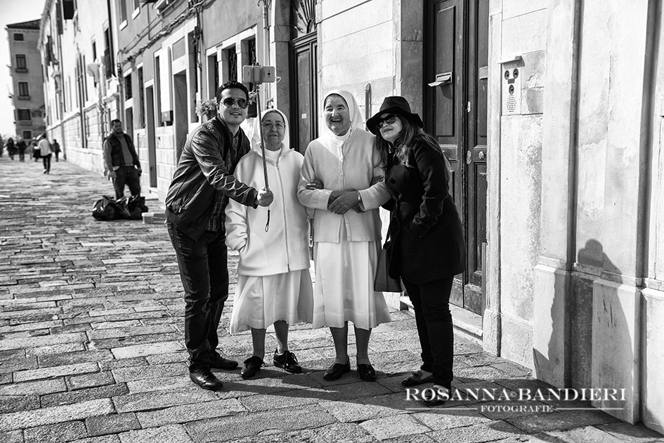 Bellissima scena. Un selfie, tu che riprendi loro, la prima suora che guarda te e l'uomo dietro che guarda tutti... Ben fatta