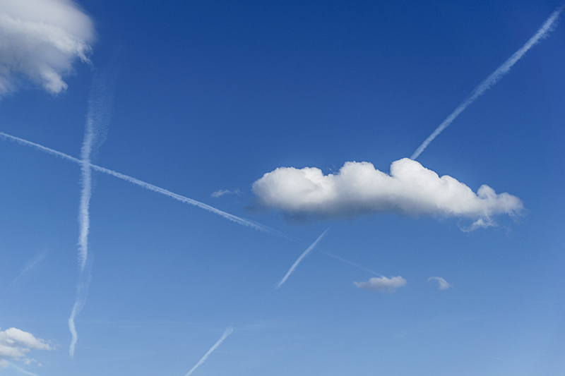 Infatti è molto carina come impatto tonale in azzurro , e la nuvoletta centrale , dalla simpatica resa tridimensionale, viaggia tranquilla fra gli incroci di scie... come un abile scassinatore che deve evitare i raggi agli infrarossi di un sofisticato antifurto bancario.. o museale ( ho proprio viaggiato con la fantasia....)