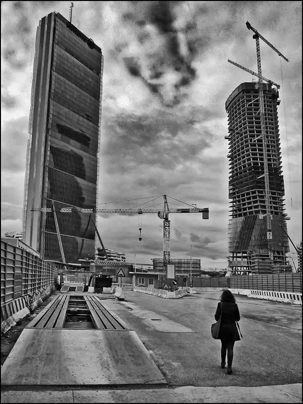 Mi piace l'accostamento tra grattacieli e passante...ma ci sono due cose a mio avviso da "brontolarci"...tu hai inclinato la macchina altrimenti avresti tagliato le cime (due grattacieli ci sono e cadono uno sull'altro) poi il BN...grigioso e senza zone bianche con qualche alone chiaro (la passante, i grattacieli).