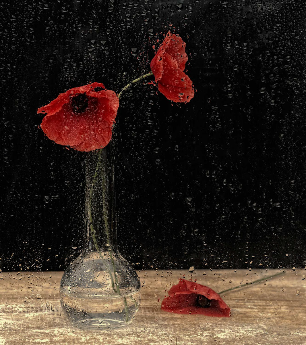 Bella assai , ma anche un po' malinconica. Sarà il gocciolare di pioggia che avvolge il tutto... e poi il papavero a terra, come sconfitto per sempre.