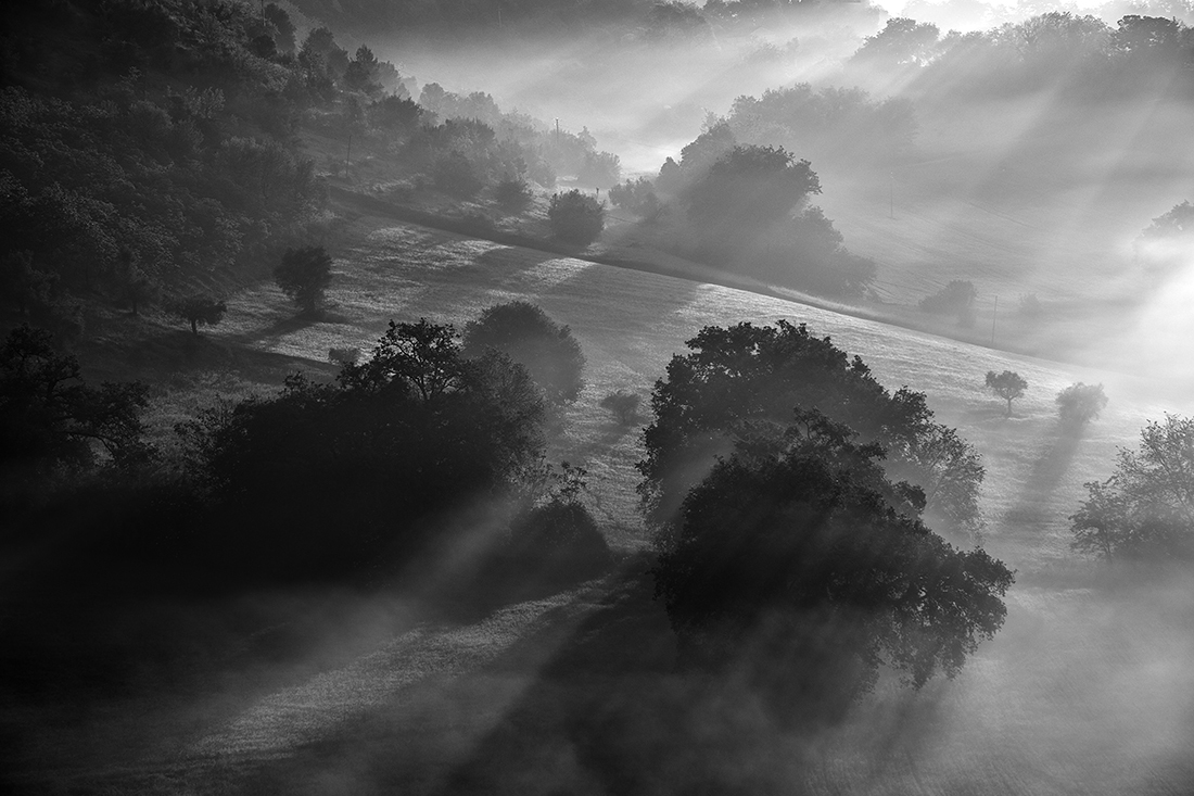 Luce spettacolare per questo bellissimo bn in tutte le sue gradazioni.Ottima composizione con le due opposte diagonali disegnate dai raggi e dal terreno.Complimenti! Ciao