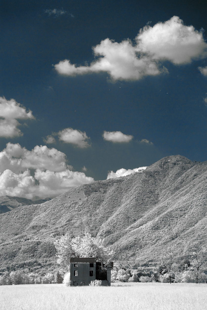In questa visione, per lo schiacciamento dei piani, il portale del casolare sembra la bocca di ingresso, di un passaggio che si addentri nel cuore della montagna. Una resa ad infrarosso che trasfigura in bellezza la realtà del paesaggio, fa candide le foglie, e mostra del luogo come un lato diverso e nuovo...
