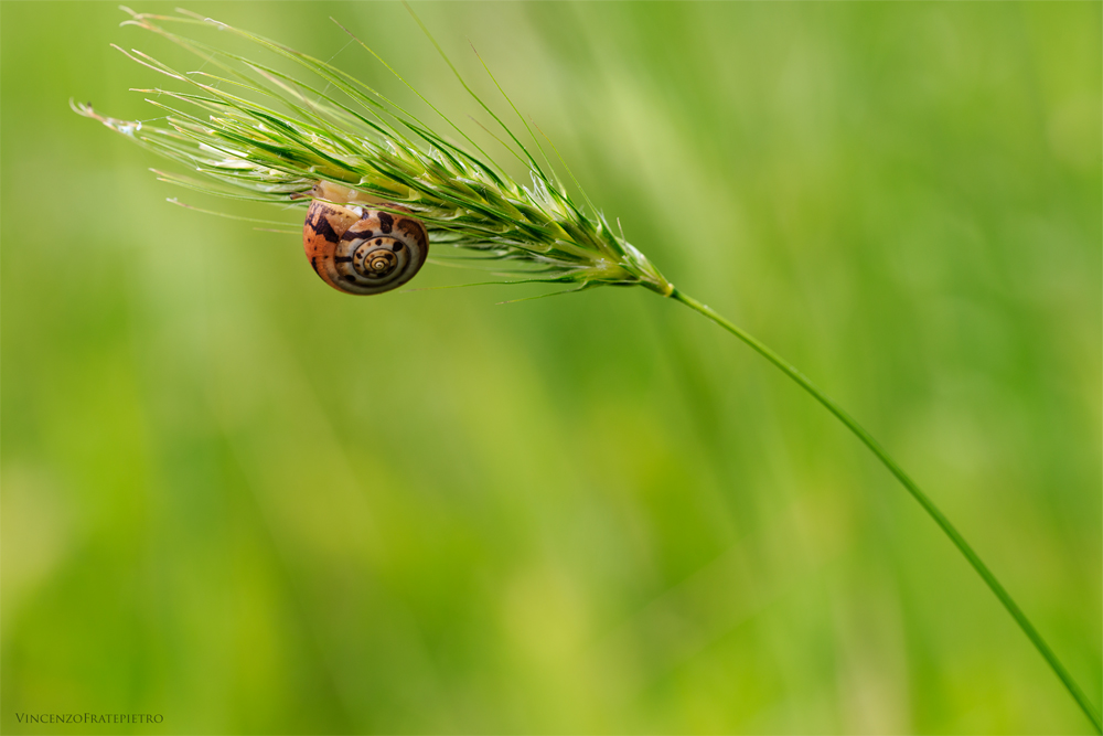 Ciao Vincenzo. Quanta eleganza in questa compo e che bellezza i colori. Così reale il tutto, sembra di avvertire la oscillazione della spiga sotto questo infinitamente piccolo peso di chiocciolina. Ironico allora ed indovinato il titolo. Per la tecnica c'è chi ti ha già consigliato al meglio.