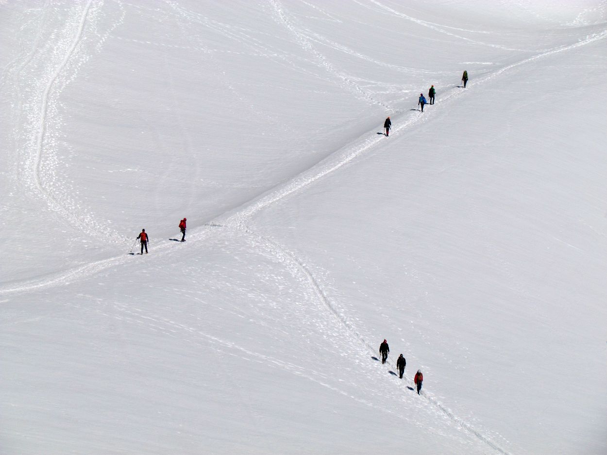 Gente che va e che viene e che si incrocia a questo bel trivio. Il taglio non mi fa impazzire. Un taglio che in composizione collocasse l'incrocio nel punto forte l'avrei preferito. La neve mi sembra avere la giusta cromia anche se a tratti ci vedo delle leggere sfumature verdine e rosine appena percettibili