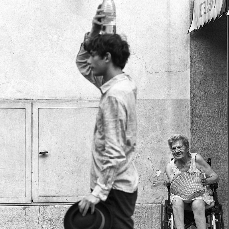 ... i tagli e la compressione dei piani dovuti al tele, focale solitamente non utilizzata nella street, offrono comunque una gerarchia visiva ben delineata che fa capolino sulla particolare espressione della signora in secondo piano.