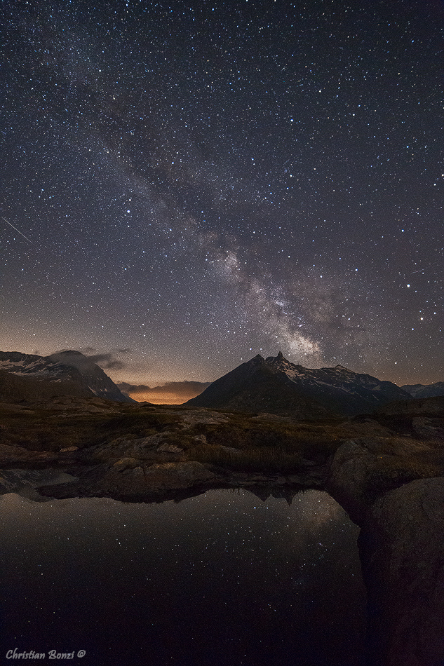 Splendida immagine con l'ottima idea del cielo stellato che si specchia nel laghetto. Trovo la composizione lievemente sbilanciata a destra. Mi spiego meglio: quello che non mi convince è il masso in basso a destra che essendo dalla stessa parte della montagna "appesantisce" un po' la parte destra del fotogramma. Forse perché troppo vicina al bordo? Spero di essere riuscito a farmi capire Smile