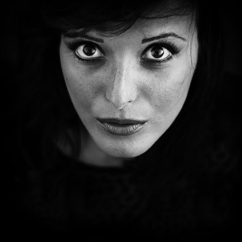 Lineamenti decisi, di forte personalità; sguardo fermo che ci colpisce , e poi quasi ci sorpassa in un mondo tutto suo. Particolare ma per me efficace questa immersione nel nero, che ben si sposa con i tratti scuri di labbra e capelli , e contorno occhi che si fanno protagonisti entro la chiarezza del volto.