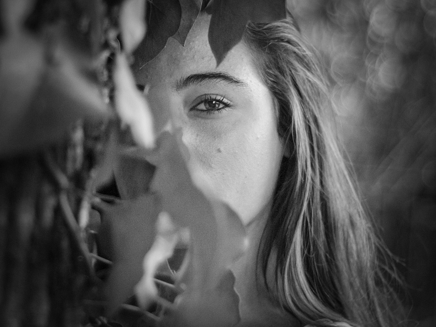 In questo piacevole gioco a nascondino in B/N la lucentezza dello sguardo è sera molto molto bene.