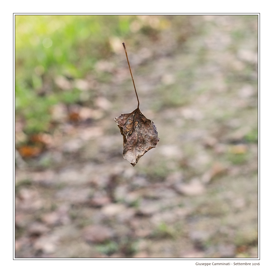 Un piccolo segreto. Non è frutto di un occhio e tempismo micidiale e neppure di fortuna a cogliere l'attimo. La foglia era sospesa ad un invisibile filo di ragno.