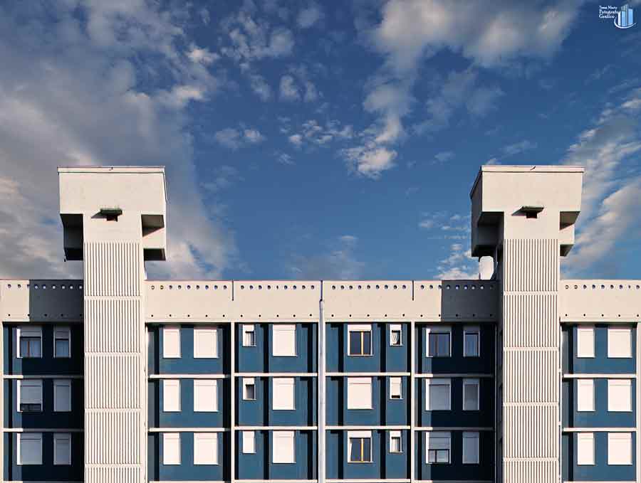 simmetria, precisione e un tocco di classe negli abbinamenti tra i colori del palazzo e del cielo. Bella e ben confezionata . L'angolo interno bianco , in basso a sx tende a scendere verso la sua destra rispetto al perfetto contrario a dx del fotogramma ( seppur irrilevante) .