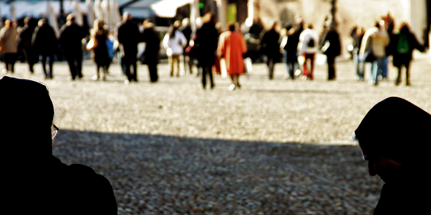 Una pletora di persone sfocate in lontananza che fanno massa e in primo piano due figure che sfilano sfuggevoli e isolate scegliendo una più intima e marginale posizione.