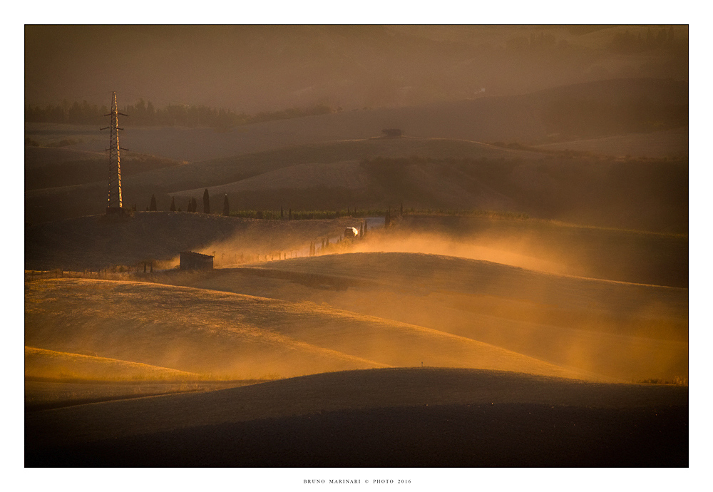 Una tempesta aurea , in un turbinio di polveri scintillanti che sconvolgono lo scenario. Delizioso il minuscolo fuoristrada bianco, che procede nel bagno di luce, e lo scintillare del traliccio ( anche se forse un po' troppo sottolineato) che si fa regista fra gli elementi.