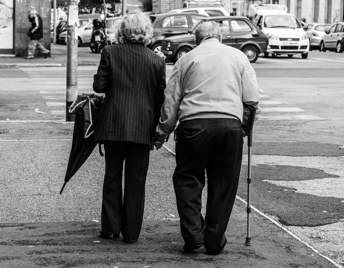 Qui i personaggi sono ripresi di spalle, e la privacy è formalmente preservata. Ma non credo sia qui il punto. Una ripresa diversa, magari Frontale, o in ogni caos dopo averi contattati, restituirebbe una situazione diversa, una attimo di intimità vera e stretta, tenera e struggente, che non sarebbe più la stessa. Qui si coglie unione della mani quasi pudicamente sottovoce, e assume un valore che si fa collettivo, no più solo riferito ai due singoli protagonisti. E' un racconto di vicinanza, che si può leggere in tanti modi. Ma che si sente forte. Poi gli abiti di lei, il gessato austero, che si fa quasi dominante, lei che sembra sostenere sì ma quasi guidare i giochi. Lui più dimesso, più piegato, con i pantaloni vissuti, dalle tasche posteriori usatissime che mille volte avranno accolto un portafoglio quotidianamente usato, ora meno a portata per mille ragioni...