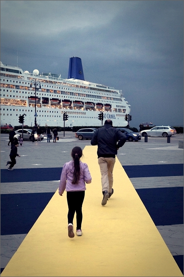 Bello l'intersevarsi dei passatoi dai colori forti, bella quasi ironica compostezza e staticità del piroscafo e dei semafori.
