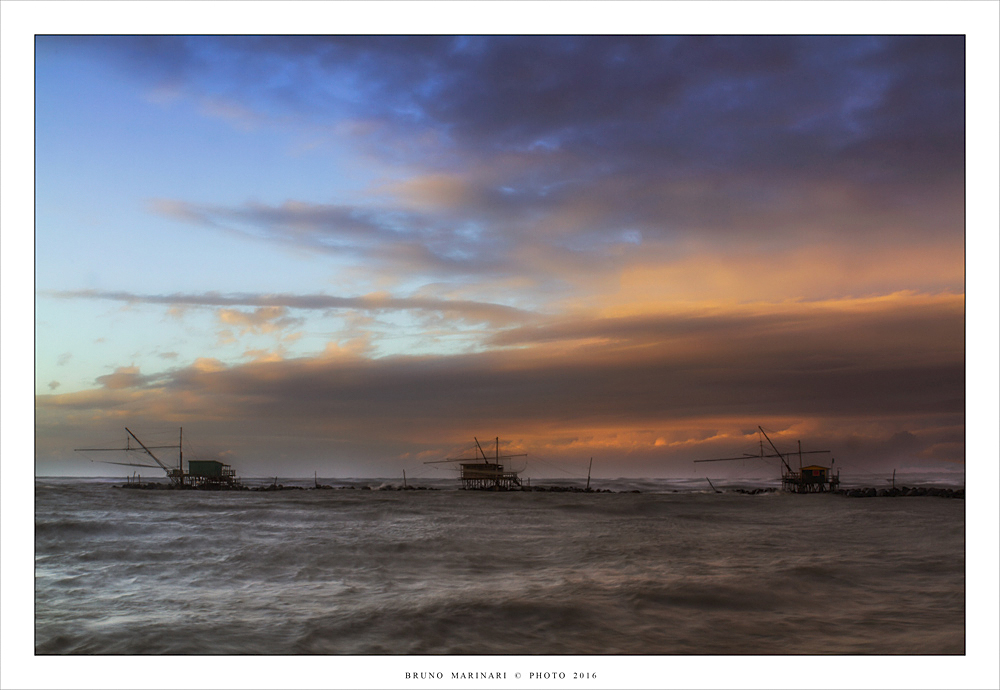 Davvero un ottimo scatto, pieno di atmosfera. Personalmente mi pare di sentire il vento che sferza l'acqua del mare. Colori accattivanti, in una bella composizione con i tre trabocchi che ben riempiono la parte bassa del frame. Una sola osservazione: non mi pare di vedere una eccellente definizione (scatto a mano libera?). _________________ Fiorenzo Carozzi