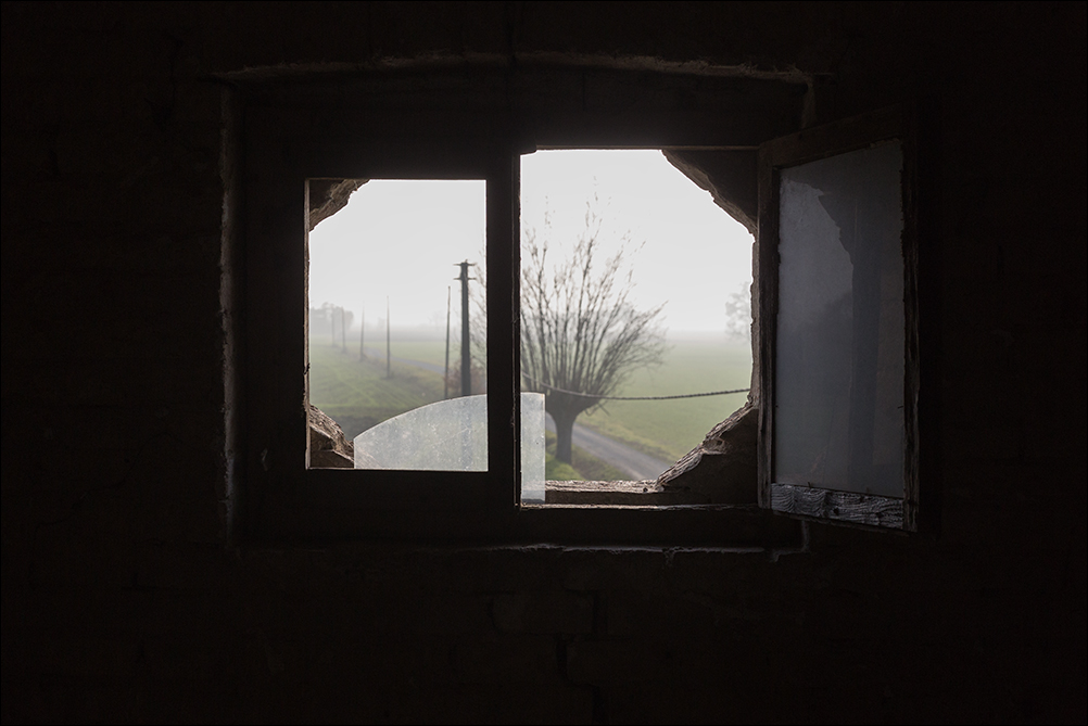 | una finestra si affaccia verso l'inverno, dove la nebbia e gli alberi spogli sono in linea con la tristezza del rudere e del vetro rotto. Mi piace l'idea |