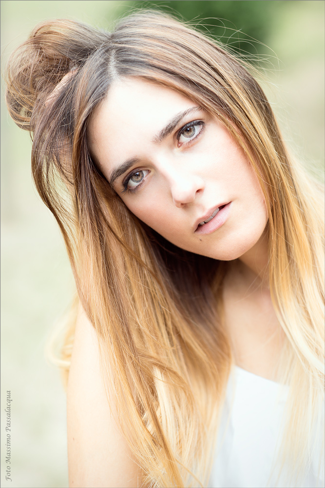 Un ritratto piacevole, anche se quella mano tra i capelli non penso ci stia molto bene. Alcune zone sembra abbiano subito un recupero delle alte luci (in basso a sx), la parte del viso in luce sembra al limite della bruciatura. |