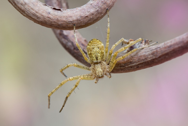 Esemplare immaturo di Philodromus aureolus, un ragno capace di camminare velocemente in tutte le direzioni, quindi anche di lato ed all'indietro, muovendosi agevolmente su rami e foglie, dove trascorre la maggior parte del suo tempo.