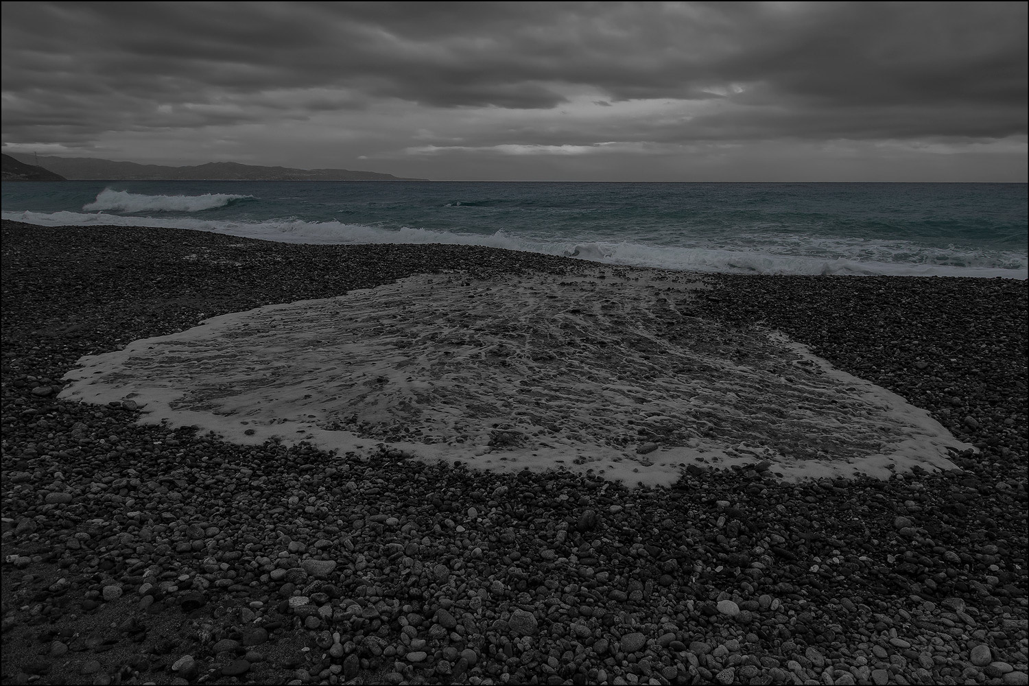un paesaggio marino che a mio avviso merita più attenzione in post...l'immagine è fortemente sottoesposta e pende leggermente a dx...piacevole invece la composizione e il pdr che dona molto interesse alla spiaggia di ciottoli e alla chiazza schiumosa riversata su di essa dal mare mosso in una grigia giornata d'inverno.