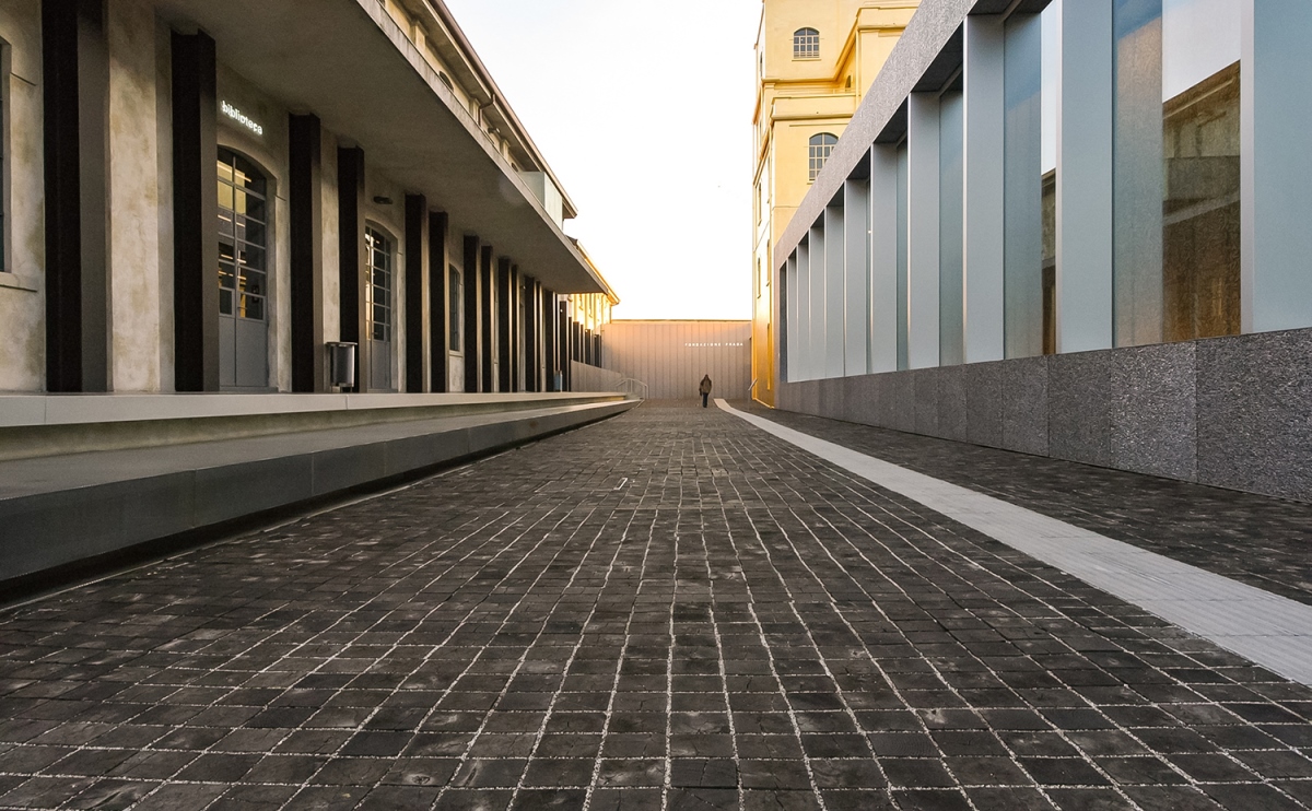 Fondazione Prada , una gran bella struttura un gran intervento architettonico , trovo sbagliata la tua scelta di abbassarti , hai incluso troppo pavimento che nn serve a nulla , mentre hai tagliato la parte superiore , quella si che ha da raccontare .