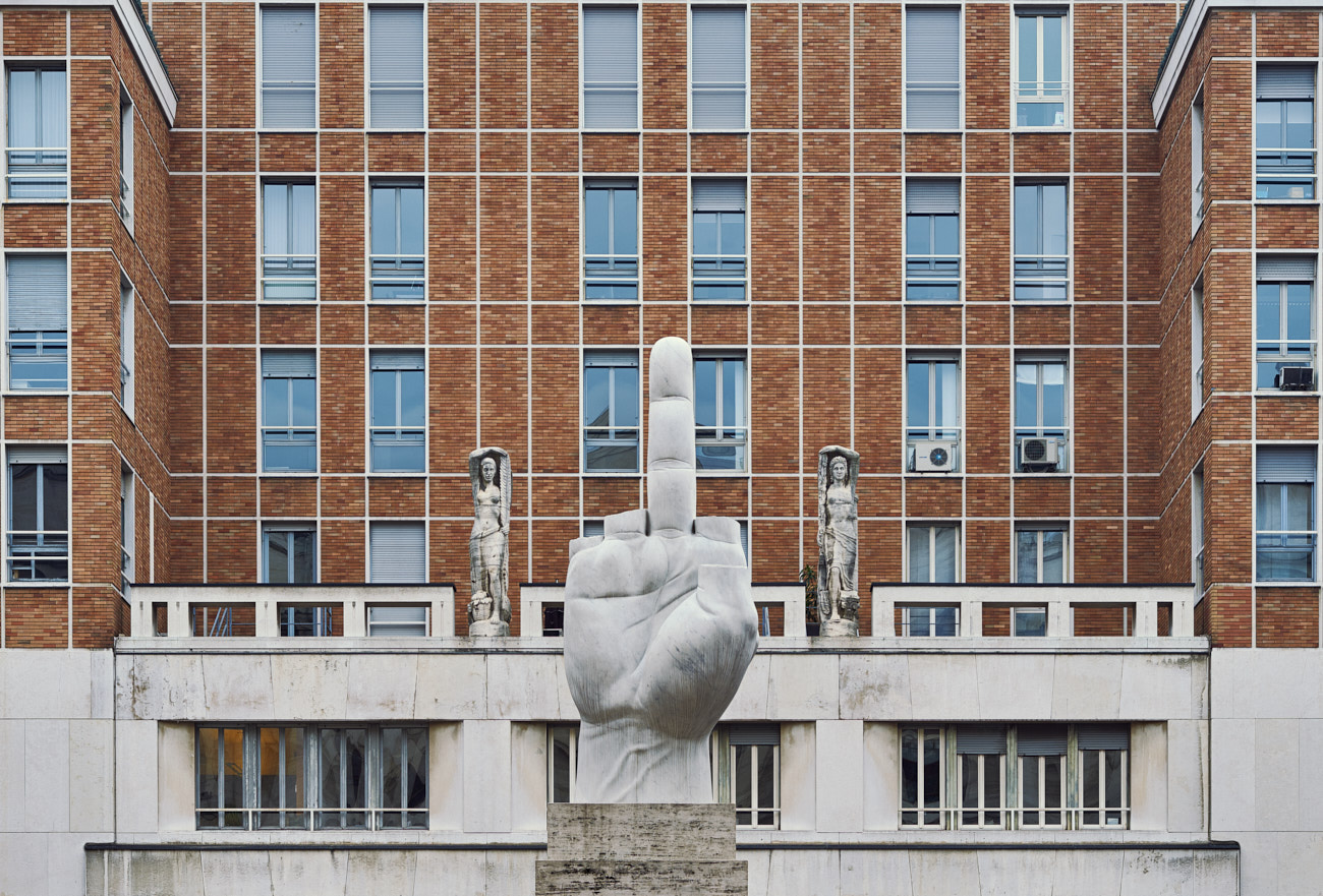 Molto bella Mark,ottima l'intuizione di usare come sfondo questo edificio,sul quale il dito di Cattelan si staglia molto meglio rispetto a Palazzo Mezzanotte