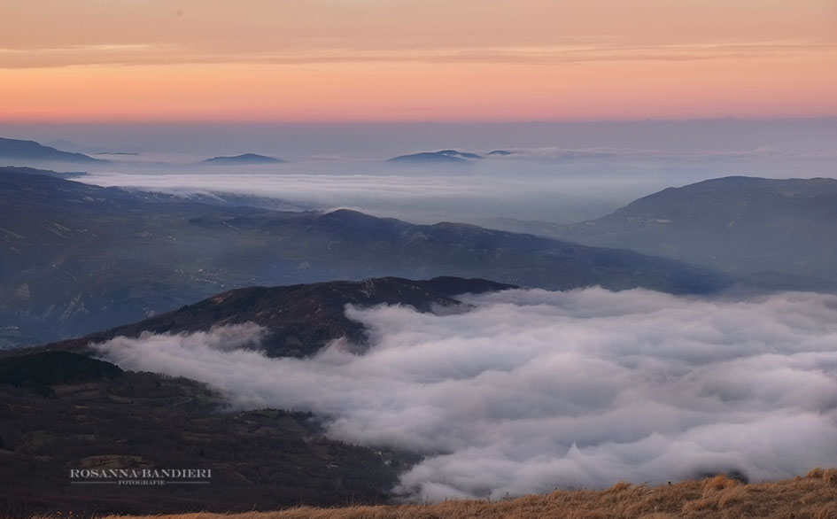 Quella che si vede in secondo piano...è la pianura in cui abito io .. Qui sulla cima del Ventasso, a circa 1800 metri, una settimana di sole pieno...Laggiù, una settimana come nella foto che ho postato oggi... Viviamo in un'ovatta umida e silenziosa, squarciata solo dai fari di qualche auto, e dalle prime lucine di Natale nei centri città...