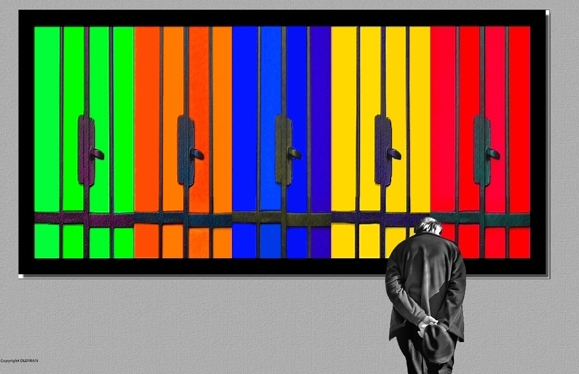 Apprezzo molto la fantasia di questa proposta ... la mia lettura parla di un arte moderna( a colori) che va in conflitto con l'ormai visione antica del vecchio che sembra inizialmente guardare il progresso dinanzi a lui per poi scendere con il capo in forma di protesta. Eppure... nonostante questo... la desaturazione sull'uomo non riesce a convincermi dal tutto. Scatto interessante Ok! Ciao