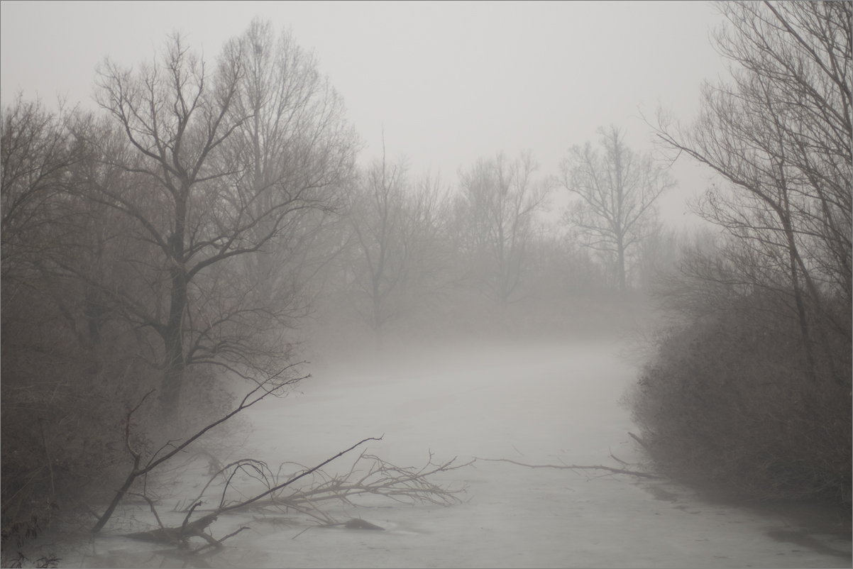 Ci sono la nebbia, i rami invernali disadorni, la curva di quello che dovrebbe essere un ramo periferico del grande fiume. Tutto è sogno e si continua a cercare qualcosa nascosto...