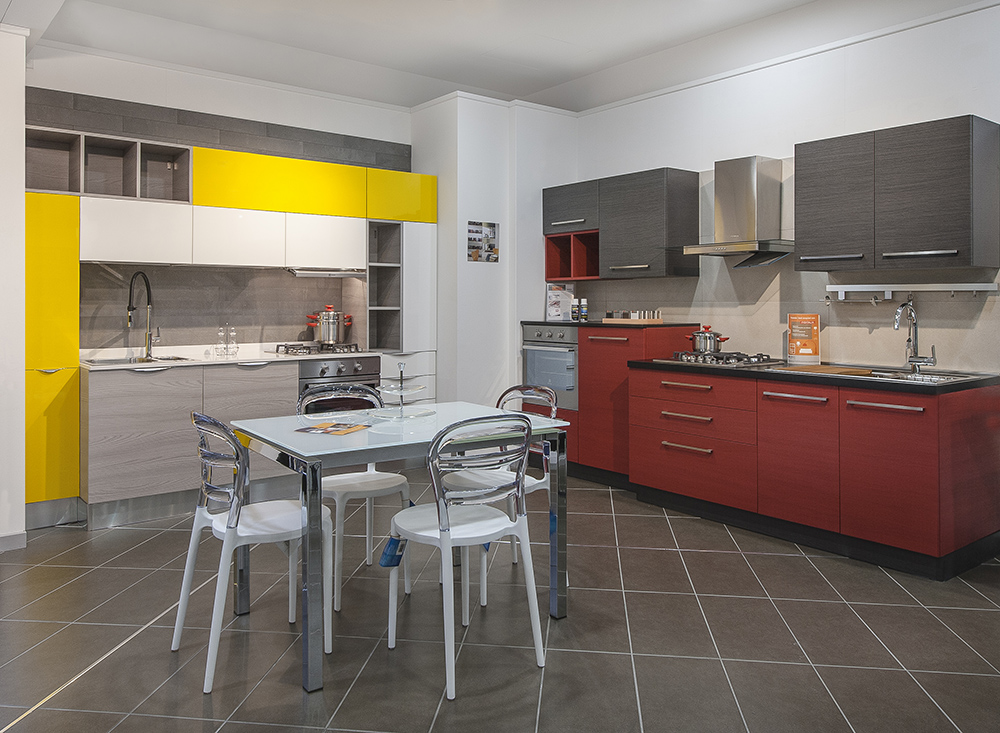Forse la più funzionale, a parità di metratura però , è la gialla: più setti e divisioni nei pensili, tipo zona biblioteca da cucina, e poi piano lavoro sottile che appare in materia nobile, tipo okite o quarzo, e lavello filo top, e con un funzionale e professional gruppo rubinetteria. E più spazio a sinistra accanto ai fuochi per appoggiare qualcosa. E nessuna cappa scenografica, bella, ma decisamente raccoglipolvere, come nella rossa!
