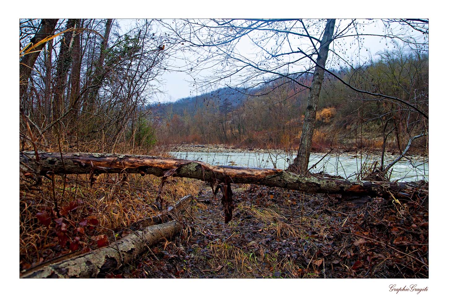 La trovo una piacevole confusione vegetale.. d'inverno. Tanta verità contorta e azzurrina nel lungo fiume, con qualche picco di arancio fra i tronchi, e una via sbarrata, letteralmente ( costituita dal grosso tronco in orizzontale) allo sguardo in avanti. Qualcosa che ci trattiene alle rive come una radice ribelle che impedisce una caviglia. Ha una sua strana armonia comunque, a mio gusto, però avrei abbassato selettivamente i toni del blu, che tra i rami in alto, fra ombre e aberrazione cromatica, diventa un po' eccessivo.