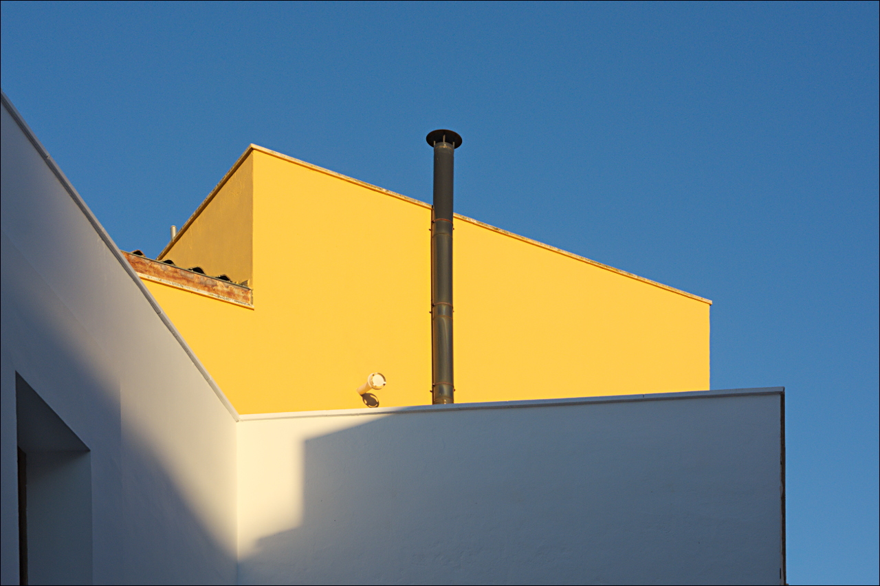 bella visione, io eliminerei la parte di cielo e lo spigolo a dx. la parte bassa in ombra presenta una leggera dominante celeste facilmente correggibile con una maschera, la parete gialla irrompe bene nel frame ma la spinta in post ha piallato tutto il dettaglio, da clonare il piccolo fumaiolo che fa capolino