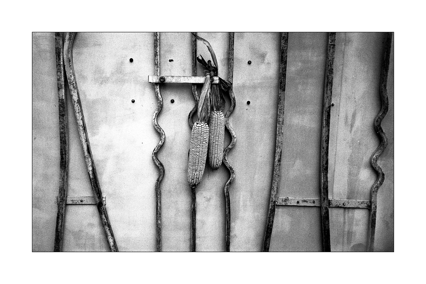Ottimo particolare che inquadra strisce varie di ferro in parete, ne mostra la matericitá con efficacia, e al centro pone le due pannocchie che in questo contesto sembrano prendere consistenza scultorea e trasformarsi a loro volta, nel b/n , in un elemento di un unico bassorilievo. Titolo cereale...delizioso
